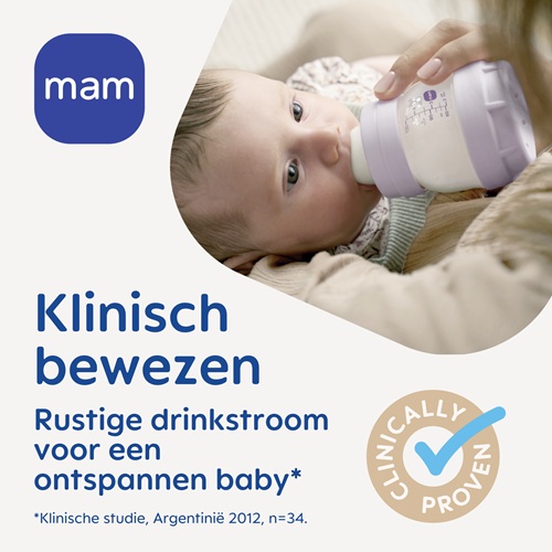 La tétine est fabriquée en silicone SkinSoft™ et offre une sensation particulièrement douce et confortable grâce à sa forme plate et unique. Imitant le sein maternel, elle procure au bébé un sentiment de familiarité. Ainsi, 94 % des bébés acceptent les tétines MAM³, facilitant la combinaison entre allaitement et biberon. Le capuchon protège la tétine, assure une fermeture étanche du biberon et peut également être utilisé comme doseur.
